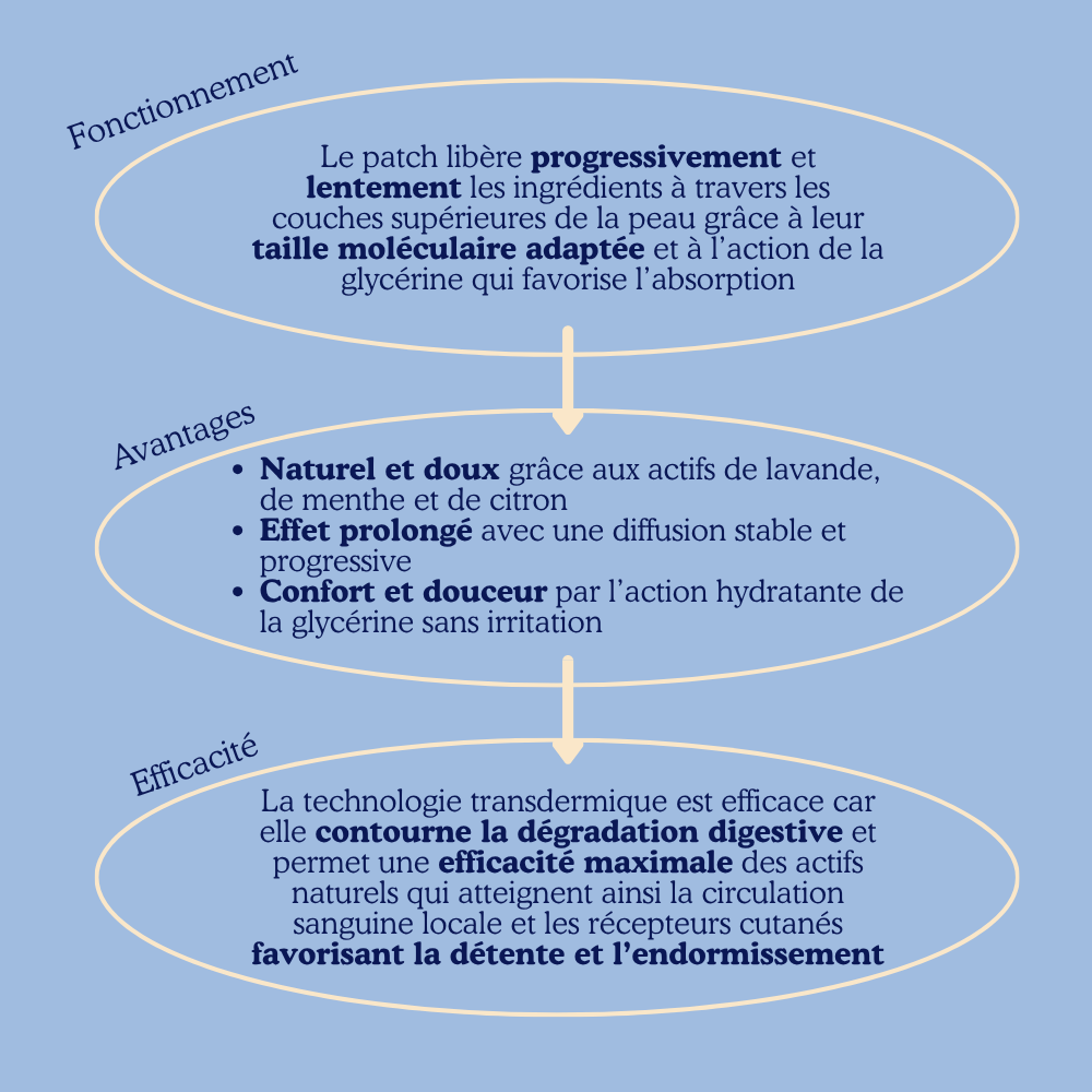 « Trés pratique et facile d'utilisation, j'adore ces patchs, la sensation est agréable… je m’endors plus vite et plus sereinement, un vrai rituel pour moi. »
